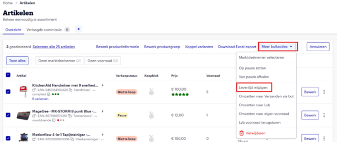 On this page, you will find information on how to adjust the delivery time for multiple items via your item overview in the seller account.