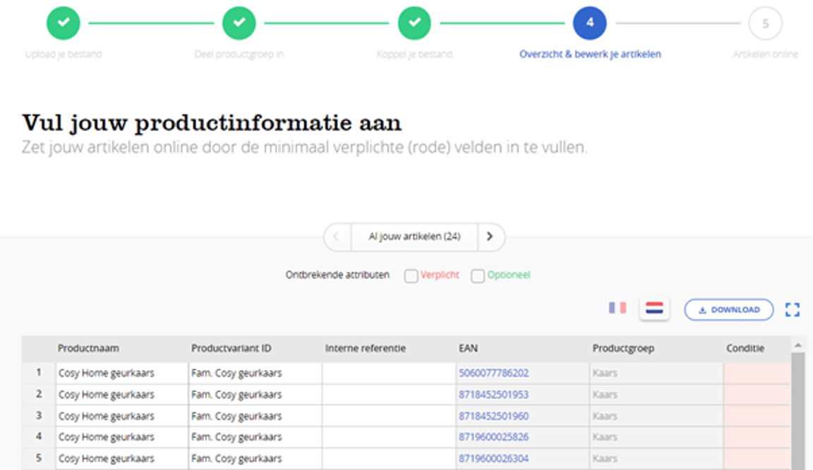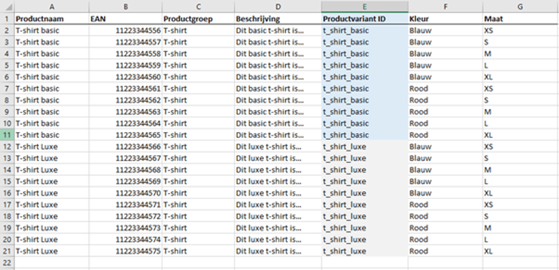 In the example below, 2 different product families are created, both consisting of 10 items. The items are linked based on the value in column E. When this value is the same, those items will be linked to a new – or existing – product family.