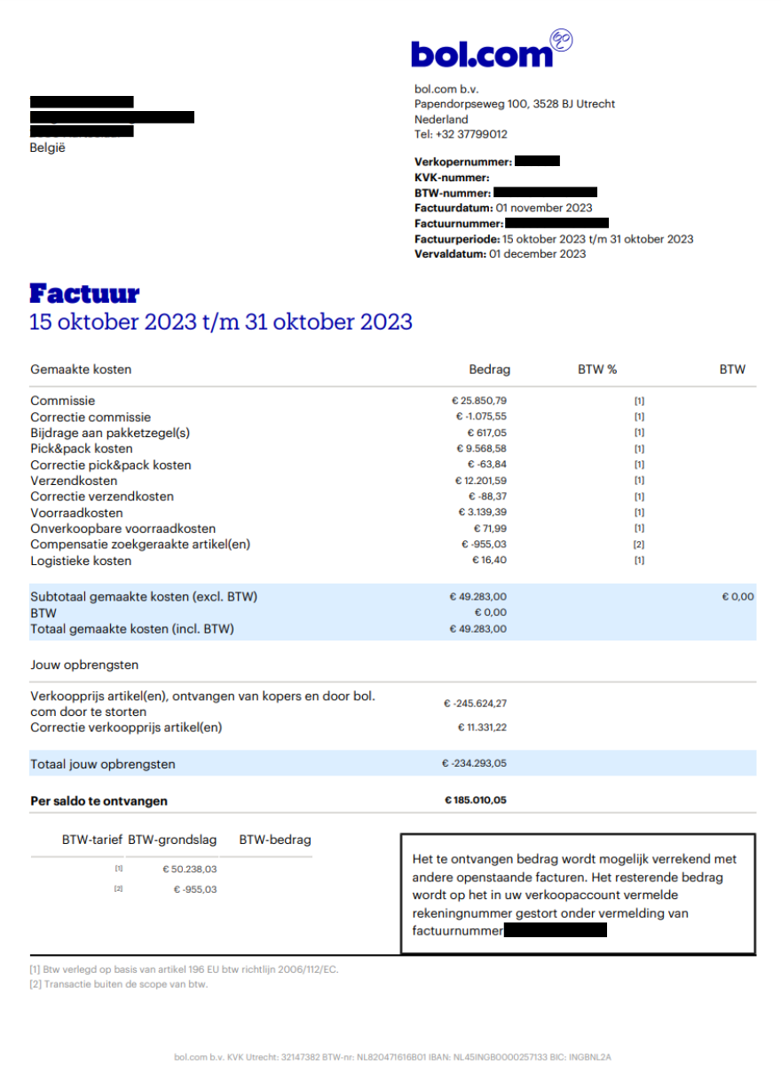 Here, a sum is made of all confirmed orders (Selling price item(s), received… ) and all returned or LIM orders (Correction selling price item.. ). Together, this forms the sum of your revenue (Total your revenue). This amount includes the VAT that customers have paid. VAT is calculated on the service between the partner and the customer. You must therefore calculate the VAT on the revenue yourself. bol cannot advise on this.