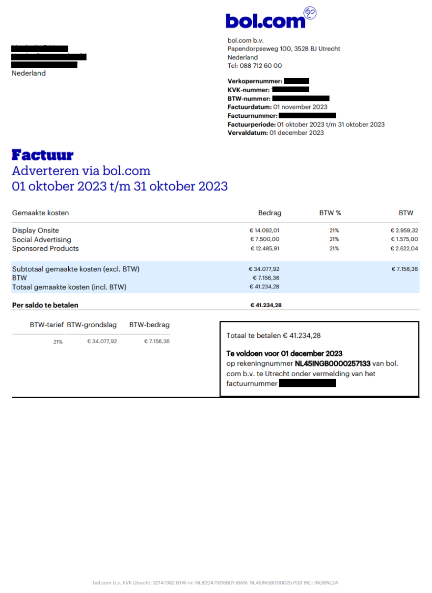 Please note! On the invoice you receive on the first day of the month, the costs of your Advertising via bol invoice up to and including the 27th of the previous month will be settled. The last 3 or 4 days of this month will be settled with the next invoice. The invoice for Advertising via bol starts on or around the 27th of the month up to and including the 27th of the following month. The exact day depends on whether a month has 30 or 31 days.