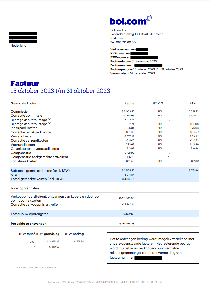 When an order is placed, the customer pays bol, and you then receive the sales amount from us, with the incurred costs deducted. An overview of all revenue and expenses can be found on your Sales Invoice, which you receive each invoice period in your seller account.