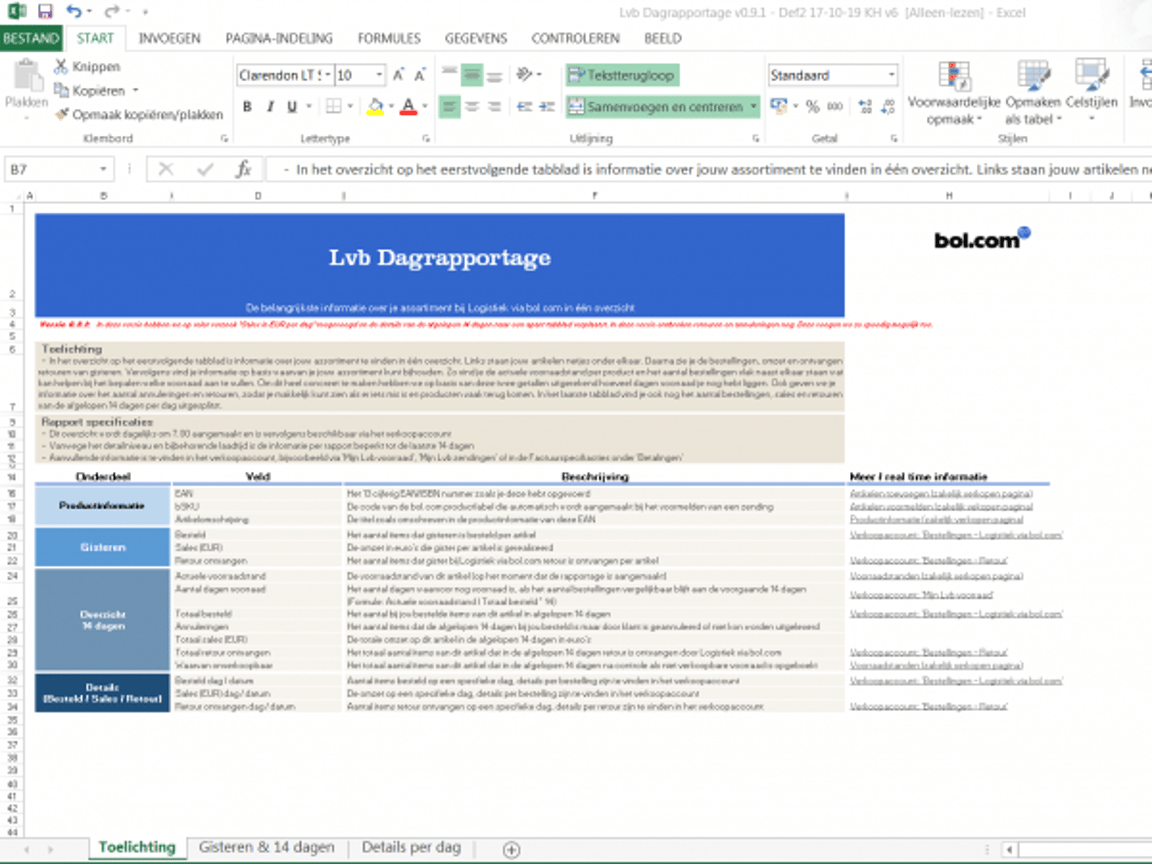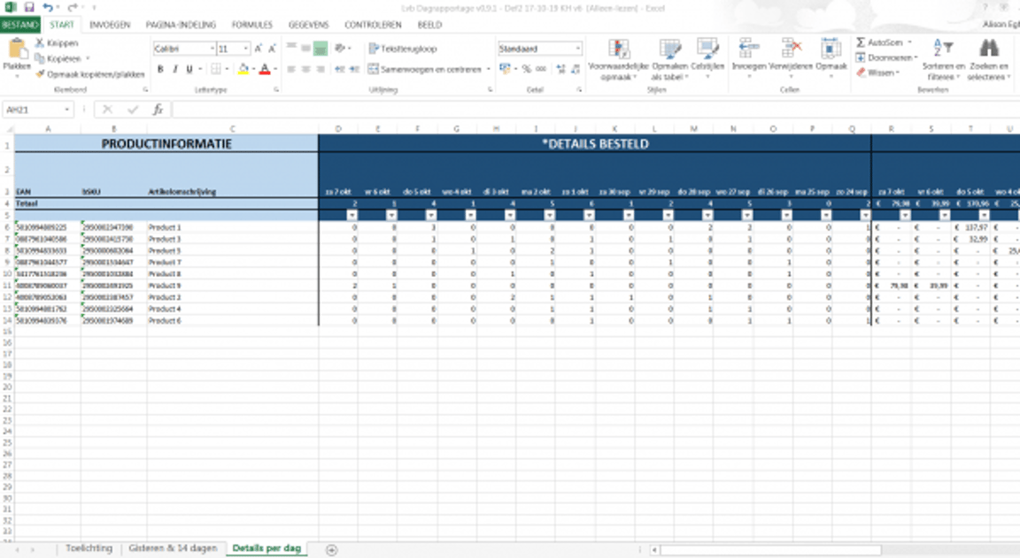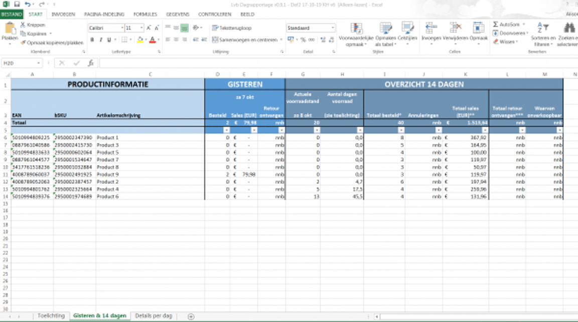 Binnen deze tab beschrijven de meest linker kolommen je productinformatie, de middelste kolommen gaan over het overzicht van de gister en de rechter kolommen over de afgelopen 14 dagen. In het toelichtingstabblad staat een korte omschrijving per kolom.
