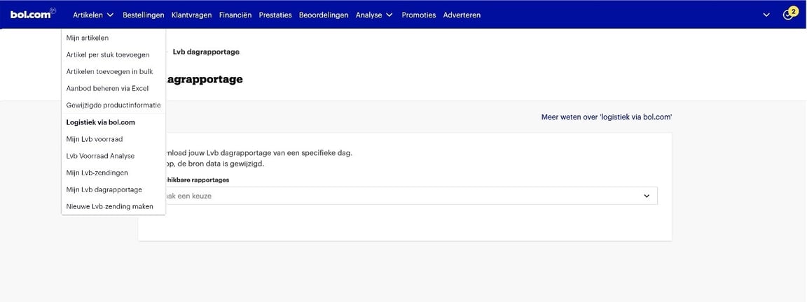 Deze vind je in je verkoopaccount onder ‘Artikelen’ – ‘Logistiek via bol’ – ‘Mijn Logistiek via bol dagrapportage’